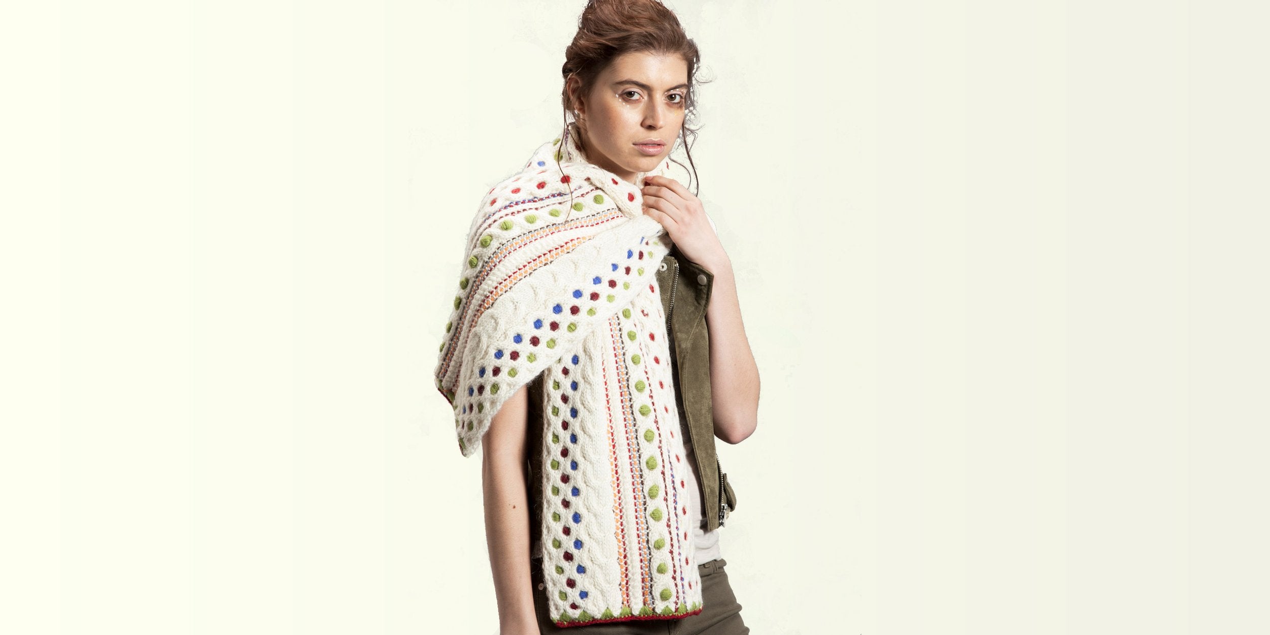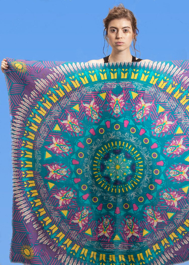Yarnz prints are inspired by a Global Nomad with an edgy twist. Tribal prints like Shipibo and Fluer-de-Lis bring Graphic Interest, while classic symbols like the British Union Jack is updated with leopard and plaid. Other highlights include, Outer Space, a lyrical image of the constellations and Camo that features the Hand of Fatima. The collection is topped off by a line of airy, gossamer wool wraps in a classic tone on tone pallet of neutrals.